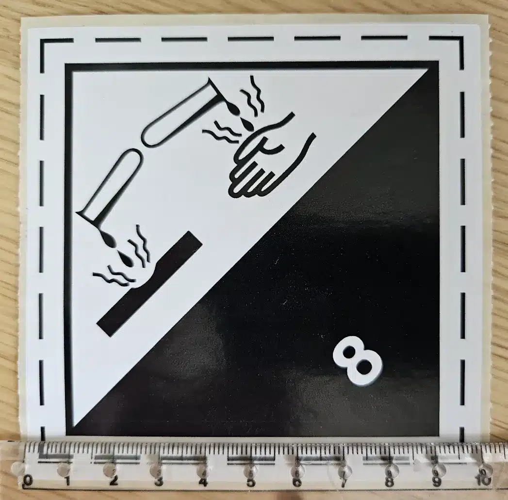 Nemrég egy 8. osztály ADR bárca öntapadós matricát rendeltünk egy, a Google találati listáján előkelő helyen szereplő magyar weboldalról. Bár a matrica mérete 100×100 mm volt, a rajzolt külső szegély nem érte el az előírt minimum 100 mm-t.