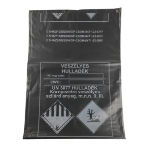 Ez a minősített ADR hulladékgyűjtő zsák ideális megoldást nyújt a veszélyes hulladékok biztonságos gyűjtésére, tárolására és szállítására. A 76 x 110 cm-es méretű, fekete színű zsák újrahasznosított polietilénből készült, és 60 mikronos vastagsága révén kiváló szakítószilárdságot és ellenállást biztosít.
